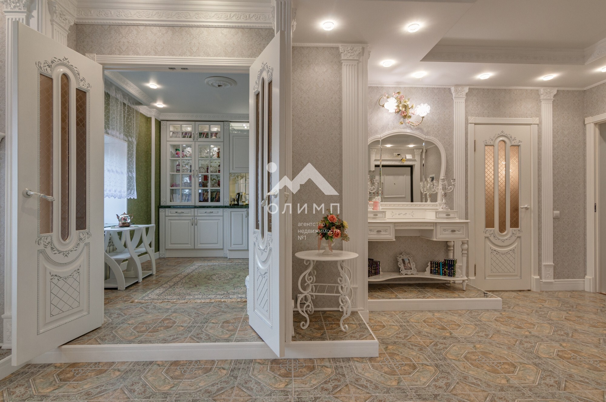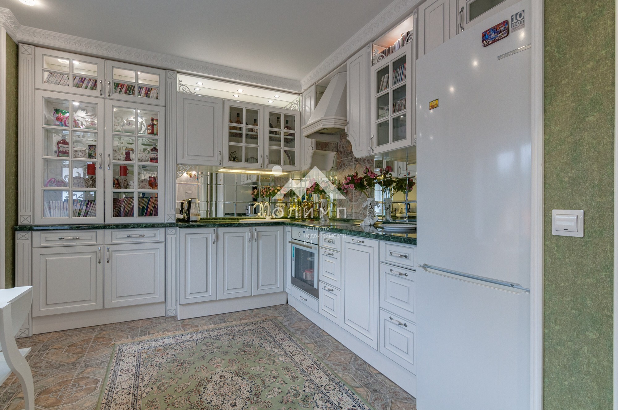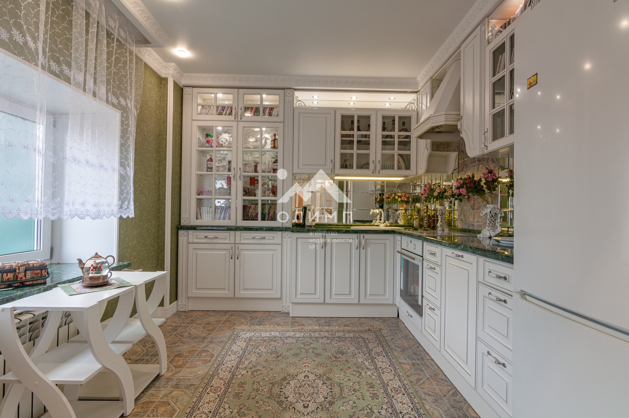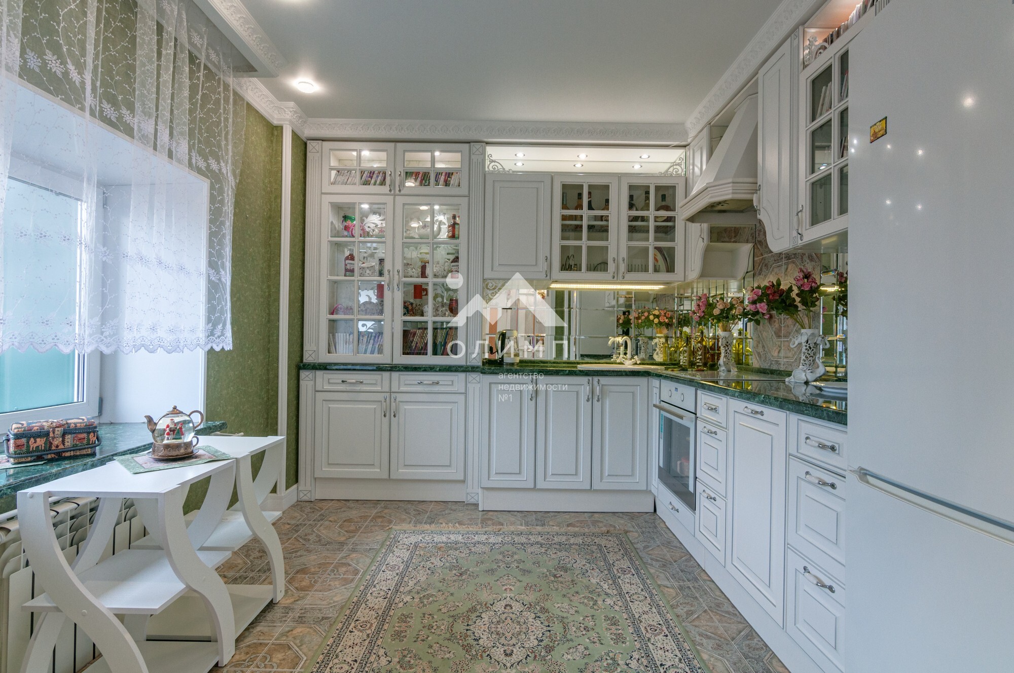 В квартире выполнен элегантный евроремонт, где каждая деталь продумана до мелочей. Плотное напольное покрытие из кафеля отличается практичностью и долговечностью, а натяжные потолки визуально расширяют пространство, создавая ощущение легкости и свободы. Цветовая палитра подобрана таким образом, чтобы создать атмосферу уюта и спокойствия. Кухонный гарнитур с зеркальным фартуком добавляет изысканности и привносит особую атмосферу для кулинарных экспериментов.