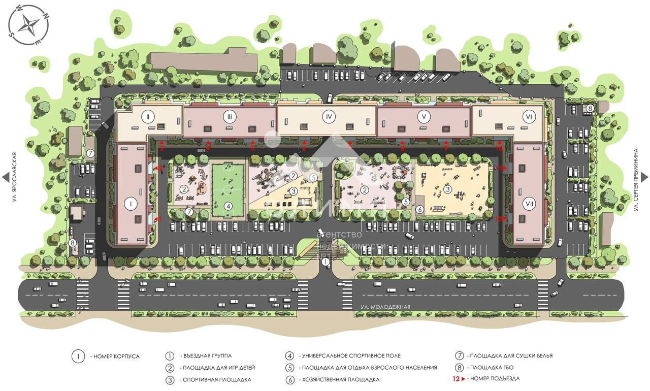 Территория огорожена и полностью безопасна: установлены автоматические ворота, камеры видеонаблюдения и умный видеодомофон. Двор поделен на две зоны, место для отдыха с одной стороны, машины с другой. Во дворе — большая современная площадка с зонами для малышей, подростков и взрослых, тренажёрами и футбольным полем. Детям точно будет чем заняться на свежем воздухе.