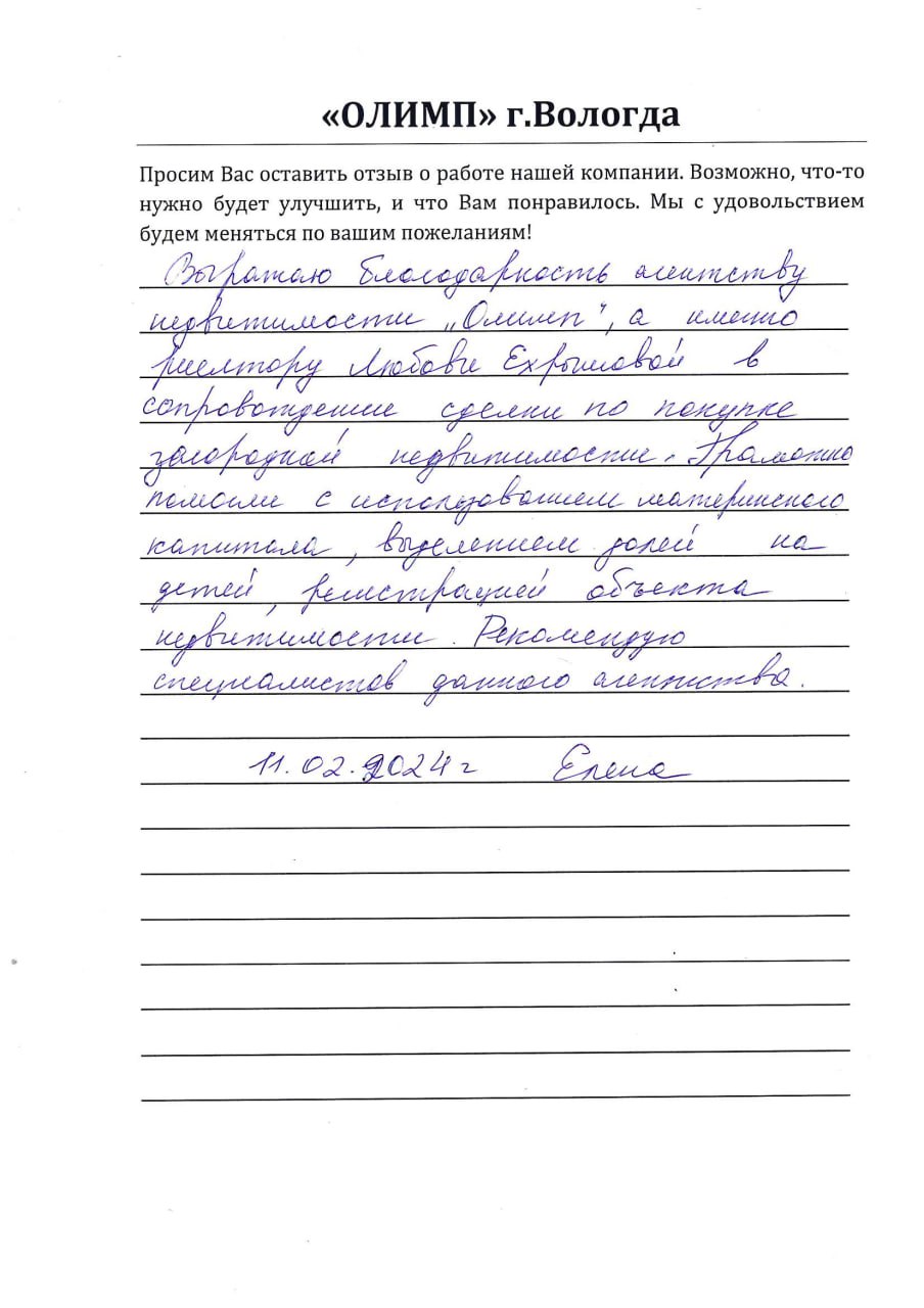 Выражаю благодарность агентству недвижимости "Олимп", а именно риелтору Любови Ехрышовой в сопровождении сделки по покупке загородной недвижимости. Грамотно помогли с использованием материнского капитала, выделением долей на детей, регистрацией объекта недвижимости. Рекомендую специалистов данного агентства.
