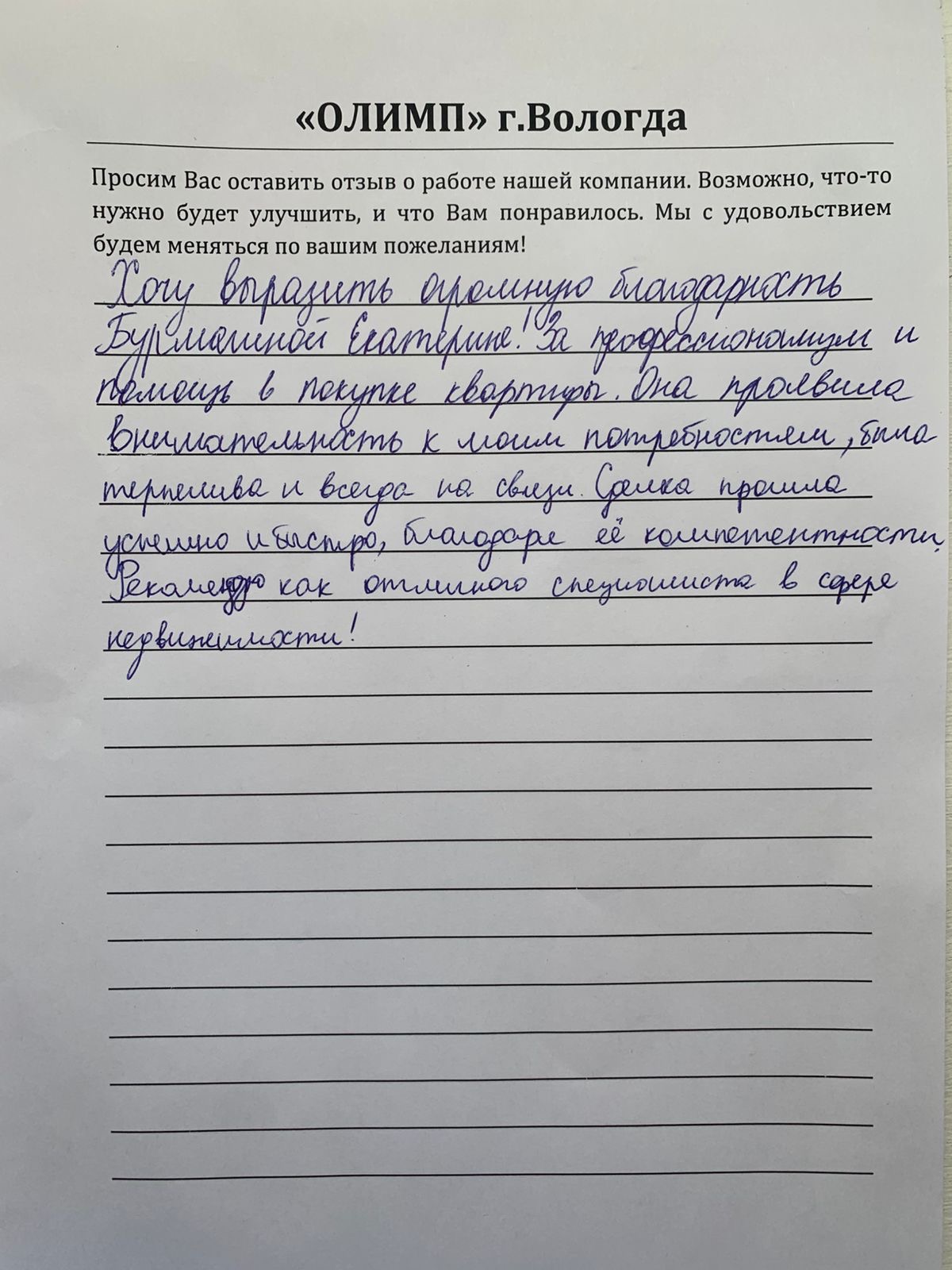 Хотим выразить свою искреннюю благодарность агентству недвижимости «Олимп», а именно Постниковой Светлане за её профессионализм, оперативность и индивидуальный подход.