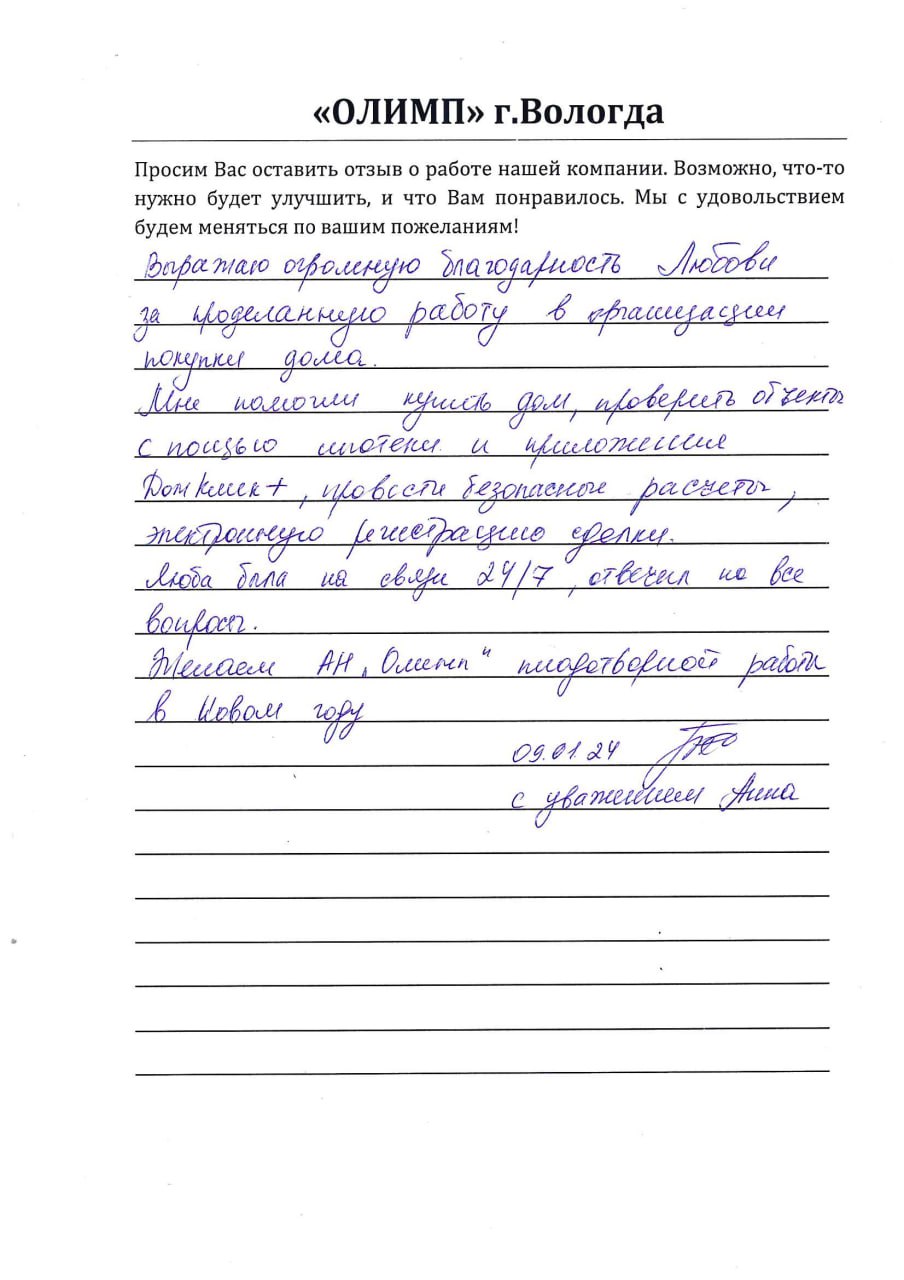 Выражаю огромную благодарность Любови за проделанную работу в организации покупки дома. Мне помогли купить дом, проверить объекты с помощью ипотеки и приложения Домклик+, провести безопасные расчёты, электронную регистрацию сделки. Люба была на связи 24/7, отвечала на все вопросы. Желаем АН "Олимп" плодотворной работы в Новом году.