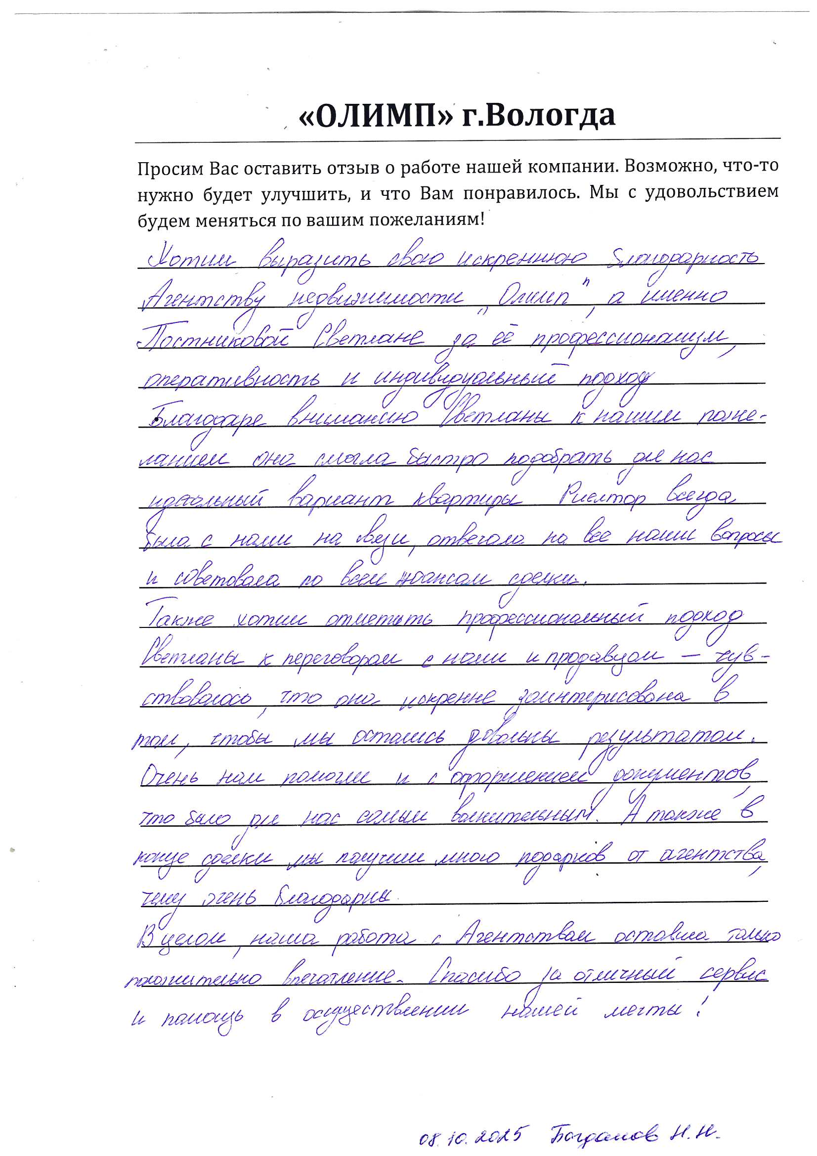 Хотим выразить свою искреннюю благодарность агентству недвижимости «Олимп», а именно Постниковой Светлане за её профессионализм, оперативность и индивидуальный подход.