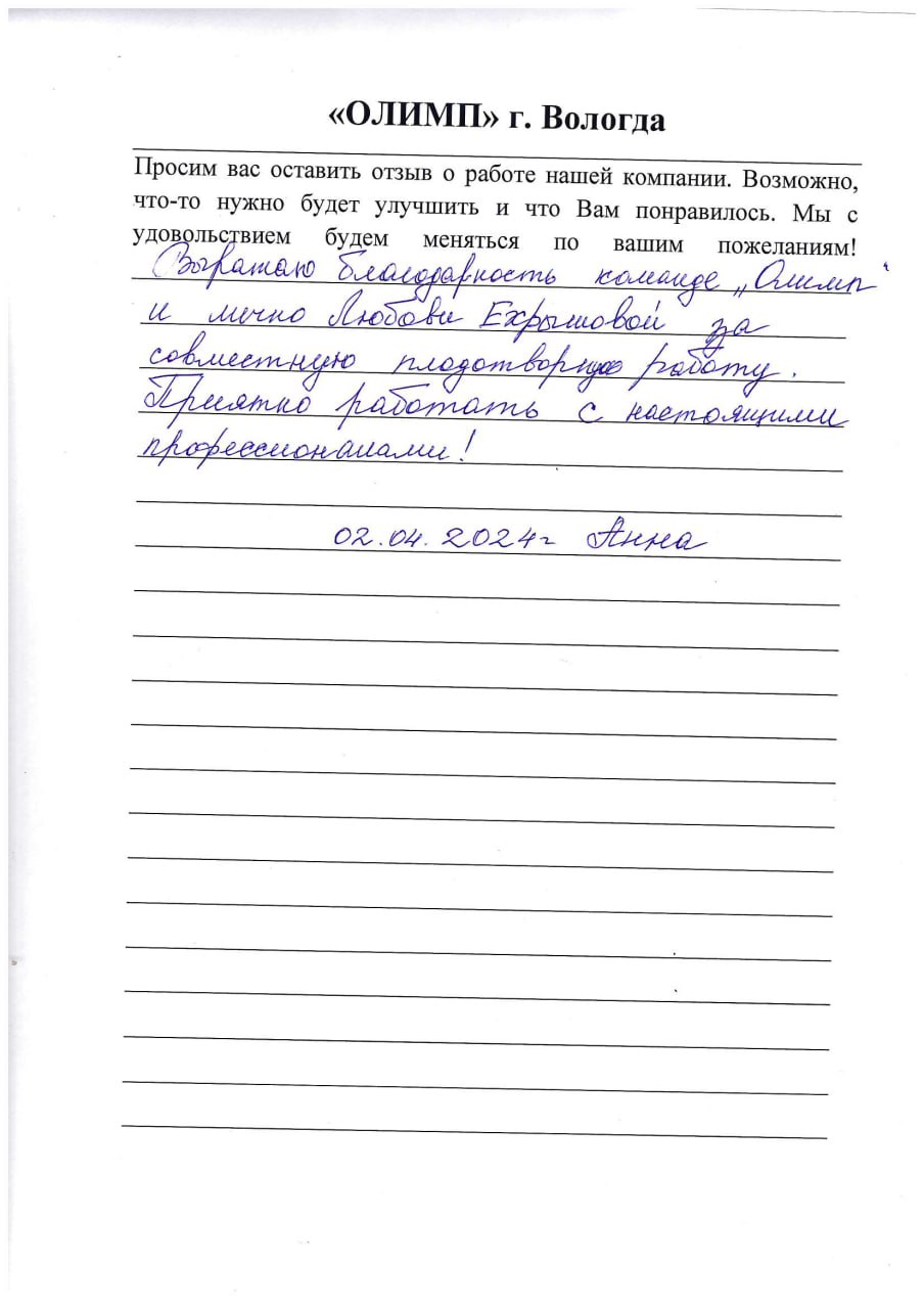 Выражаю благодарность команде "Олимп" и лично Любови Ехрышовой за совместную плодотворную работу. Приятно работать с настоящими профессионалами! Анна